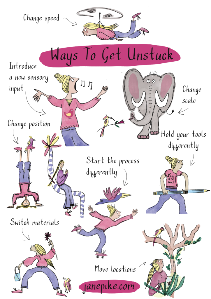 I didn’t want the important bits — the ones you can actually apply — to get lost in the mix, so I’ve made an illustrated version for you here, with a downloadable poster at the end if you need a little creative un-stucking.